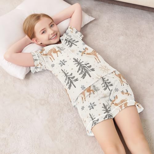 HOT ! senya Deer with Tree Winter Satin Summer Pajama Sets Silk Short Sleeve Button Down Sleepwear