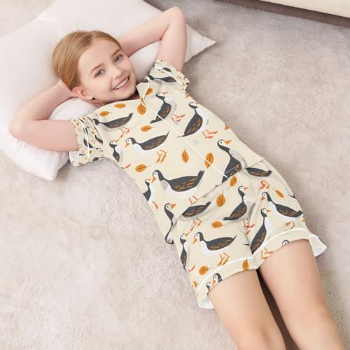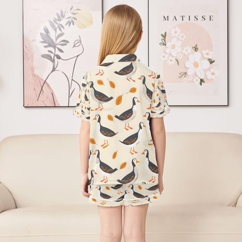 HOT ! senya Duck and Leaves Satin Summer Pajama Sets Silk Short Sleeve Button Down Sleepwear