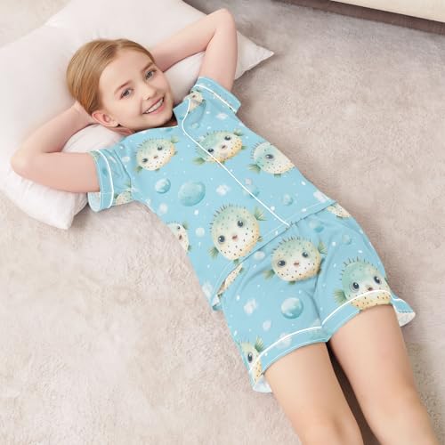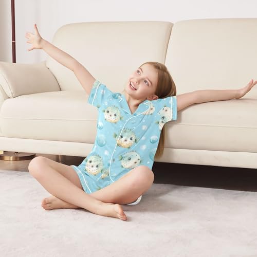 HOT ! Blue Puffer Fish Pattern Summer Satin Pajama Set, Cute Button-Down Sleepwear Pj Set for Sleep Wears
