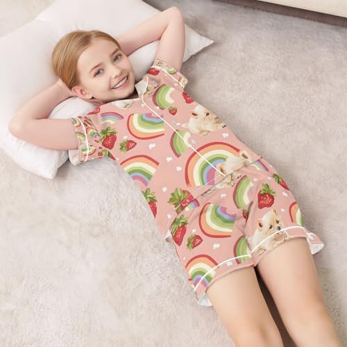 HOT ! senya Strawberry Puppy Rainbow Satin Summer Pajama Sets Silk Short Sleeve Button Down Sleepwear