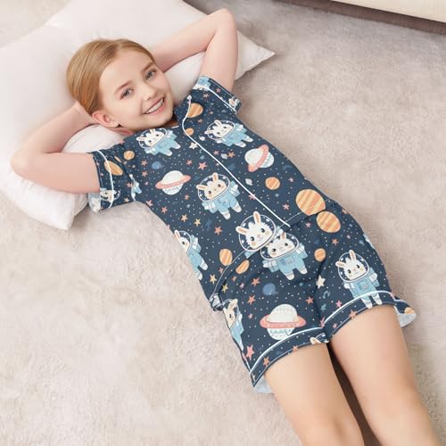 ALAZA Astronaut Bunny Rabbit Star Pajamas Satin Pajama Set Short Sleeve Button Down Sleepwear 3