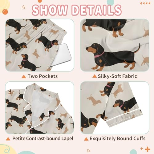 Black Dachshund Pattern Summer Satin Pajama Set, Cute Button-Down Sleepwear Pj Set for Sleep Wears 7
