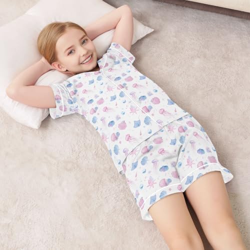 Dreamy Jellyfish Pattern Summer Satin Pajama Set, Cute Button-Down Sleepwear Pj Set for Sleep Wears 5