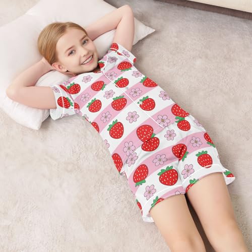 HOT ! Simple Cute Strawberry Flower Pattern Summer Satin Pajama Set, Cute Button-Down Sleepwear Pj Set for Sleep Wears