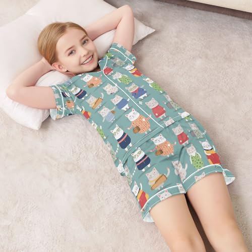 senya Colorful White Cat Satin Summer Pajama Sets Silk Short Sleeve Button Down Sleepwear 5