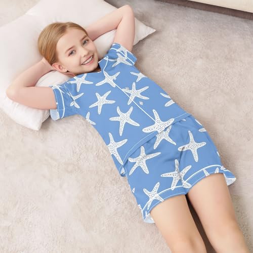 HOT ! Blue Simple Starfish Pattern Summer Satin Pajama Set, Cute Button-Down Sleepwear Pj Set for Sleep Wears