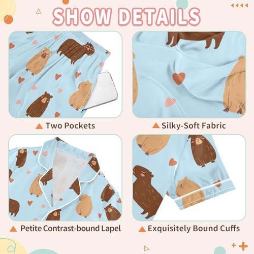More information about Cute Capybara Drawing Blue Summer Satin Pajama Set, Cute Button-Down Sleepwear Pj Set for Sleep Wears