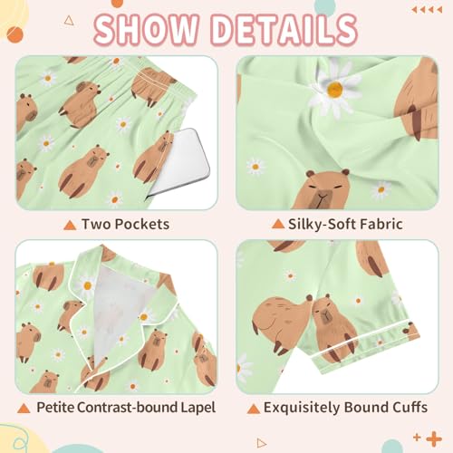 More information about Capybara with Daisy Flowers Green Summer Satin Pajama Set, Cute Button-Down Sleepwear Pj Set for Sleep Wears