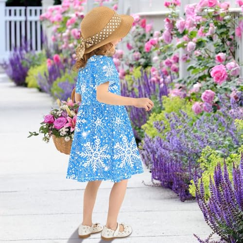Toddler Girls Short Sleeve Dress White Snowflakes Blue Summer Kids Sundress Playwear Casual Outfits 2T-8T 5