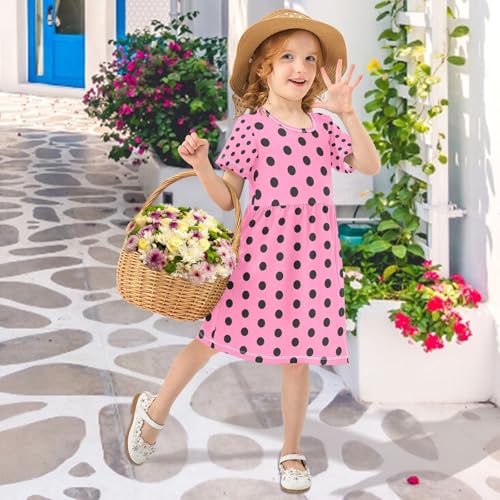 Polka Dots Pink Black Girls Short Sleeve Dress Summer Fashion A-line Skater Dresses 6