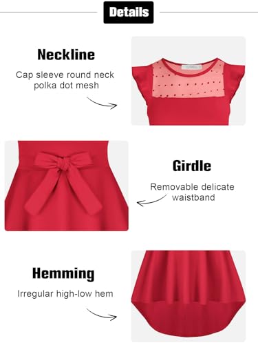 • 【Features】Pockets casual party dresses with removable belt, ruffle sleeve, high waist A line, polka dot mesh, high low hem, elastic waist, sleeveless belted dress