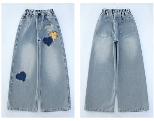 HOT ! Y2K Cute Baggy Heart Print Jeans for Girls Kids High Waisted Straight Wide Leg Elastic Waist Pull On Jean Pants 8-14 Years