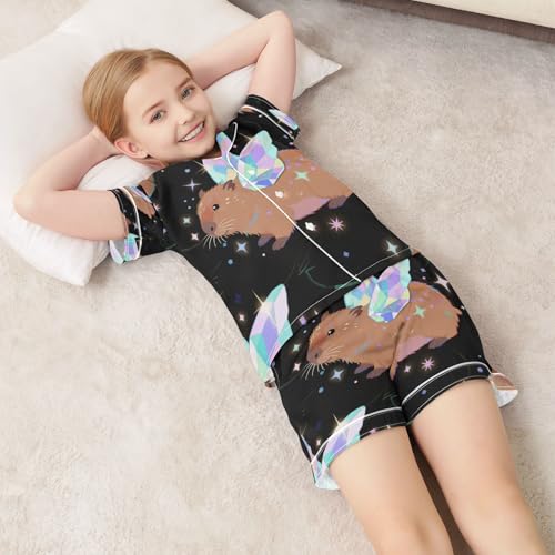 Satin Pajama Sets Short Sleeve Magical Guinea Pig with Wings Button Down Silky Nightwear 2 Piece PJS 5-14Y 1