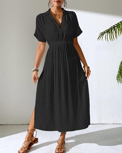 Bsubseach Women's Long Swimsuit Coverup 2025 Casual V Neck Beach Dress Short Sleeve Elastic Waist Swimwear Cover Ups 5