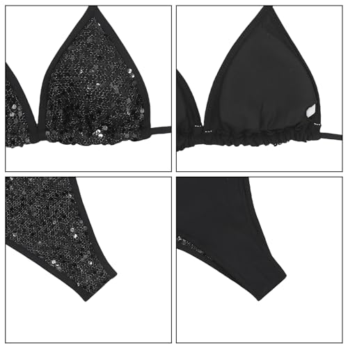 • Two Piece Bikini Sets: This bikini set contains sequins triangle top, adjustable halter neck and back straps for better fit, soft push up padding. High cut leg thong bikini bottom with tie side strings. This backless high cut sequins bikini set perfectly showcase your sexy and charming figure.