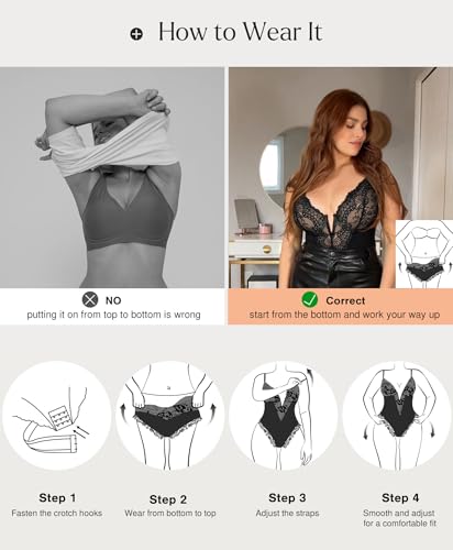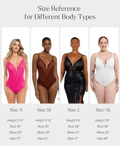 • SIZE TIPS: Our lace bodysuit sculpts your curves by flattening the abdomen, slimming the waist, and lifting the hips. A snug fit is normal. Please refer to our size chart for bust, waist, and hip measurements. Increase by one size for a C cup, and go up by two sizes for cup sizes above C