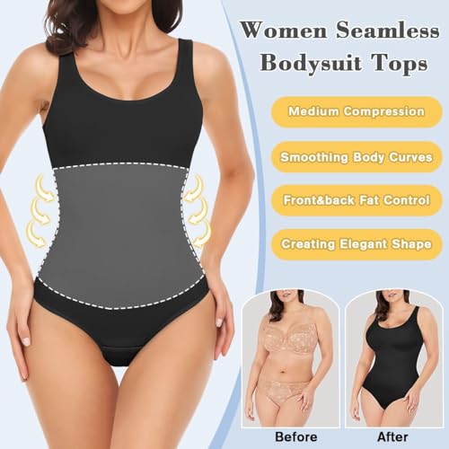 • 【Seamless & Comfortable】: 90% nylon + 10% spandex. Lightweight and soft, skin-friendly and breathable, seamless and highly elastic for creating a smooth silhouette and fitting the curve of the body, no steel bones or wires, very comfortable to wear the bodysuit for women all day.