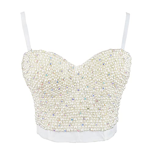 ELLACCI Sexy Pearls Beaded Rhinestone Bustier Crop Top Push up Corset Top with Detachable Straps 1