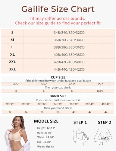 • Universal Fit: Easy Size Guide: S (34B, 34C, 32D, 32DD); M (36B, 36C, 34D, 34DD); L (38B, 38C, 36D, 36DD); XL (40B, 40C, 38D, 38DD); 2XL (42B, 42C, 40D, 40DD); 3XL (44B, 44C, 42D, 42DD). This no-wire, full-support bra is designed for various breast shapes and sizes, from small to plus-size, suitable for women of all ages