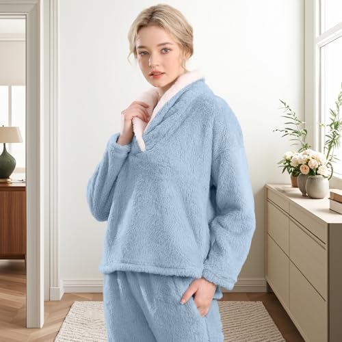 Fluffy Pajamas for Women Set Soft Comfy Fleece Pjs Pullover Pants Loose Plush 2 Piece Sleepwear Fuzzy for Winter 6