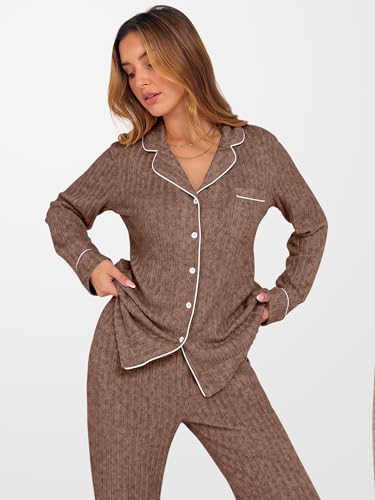 ANRABESS Women Pajama Lounge Sets 2025 Fall 2 Piece Outfits Ribbed Long Sleeve Matching PJ Set Sleepwear Loungewear 2