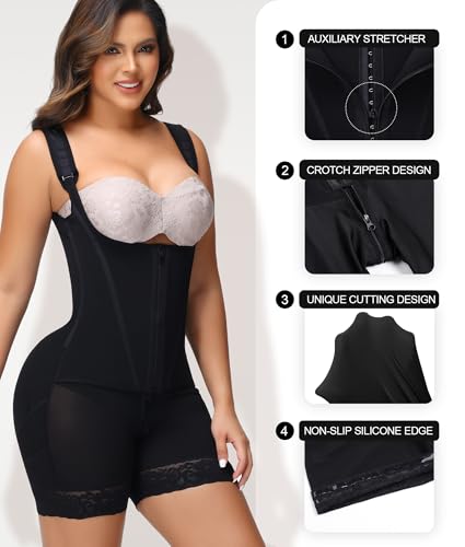 • UPGRADED DETAILS: Adjustable 7-section widened shoulder straps, light and comfortable sponge pads, double the comfort of shoulders. The compression garment uses 3 rows of hooks to adjust the size freely. The trouser legs are made of single-layer high-elastic fabric, which effectively tightens leg fat and is suitable for all leg shapes and sizes. The body shaper adopts an open crotch design, which is convenient for use in toilets and bathrooms.