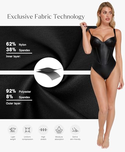 HOT ! Popilush Leather Corset Bodysuit for Women Tummy Control V Neck Thong Shapewear Sleeveless Body Suit Tops