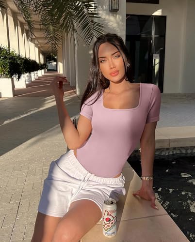 • Sexy Ribbed Square Neck Short Sleeve Bodysuits, flattering square neckline, short sleeve, simple in design,don’t see through, Best womens, ladies and teen girl clothes.