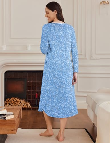 Ekouaer Women's Long Sleeve Nightgown Long Sleepshirt Henley Nightgowns Full Length Sleep Dress with Pockets S-3XL 4