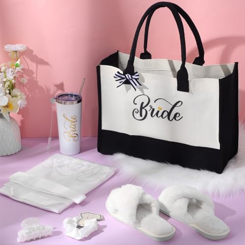 • Safe and Quality Materials: the bride robe for wedding day is made of soft silk, comfortable to wear, these bridal party slippers adopt plush and rubber bottom, resistant to slip, the bride insulated tumbler is crafted with stainless steel, not easy to rust, the canvas tote bag is sturdy and lasting, and white crystal satin scrunchy is elastic to use, and the acrylic hair clip is smooth and reliable, not easy to break, which can serve you for a long time