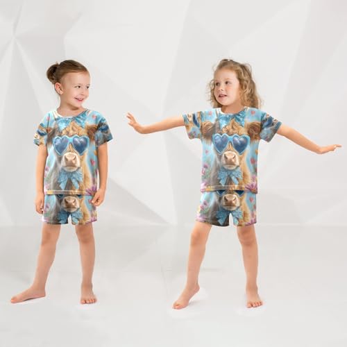 ALAZA Highland Cattle Flower Heart Pajamas Set Short Sleeve Cotton Sleepwear Summer Pjs 2 Piece 5-14Y 5
