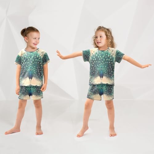 ALAZA Green Feather Peacock Pajamas Set Short Sleeve Cotton Sleepwear Summer Pjs 2 Piece 5-14Y 2