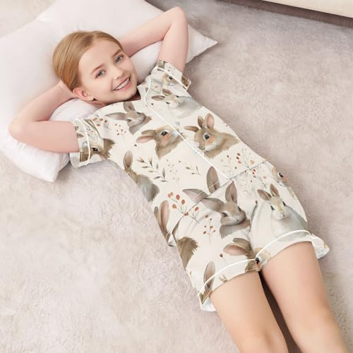 ALAZA Lovely Rabbit Watercolor Leaves Pajamas Satin Pajama Set Short Sleeve Button Down Sleepwear 3