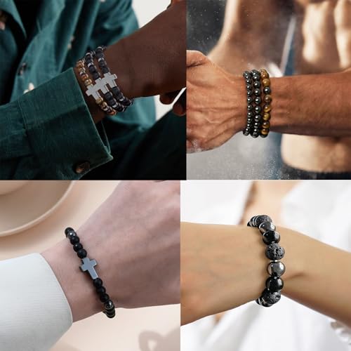 Cross Bead Bracelet for Men Women,8mm Tiger Eye, Lava Rock, Black Obsidian Healing Crystal Beaded Bracelets,Natural Protection Stone Bracelets Jewelry Gifts for Men Women 2