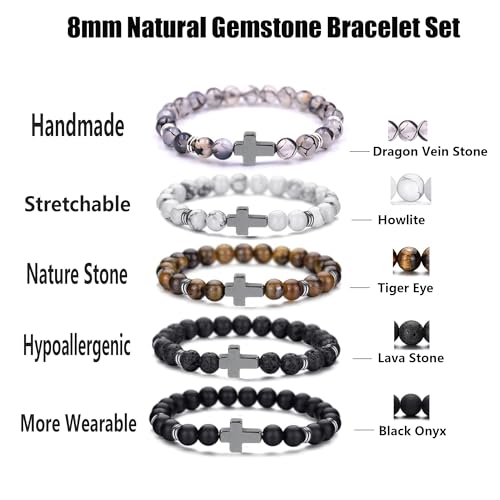 Cross Bead Bracelet for Men Women,8mm Tiger Eye, Lava Rock, Black Obsidian Healing Crystal Beaded Bracelets,Natural Protection Stone Bracelets Jewelry Gifts for Men Women 5