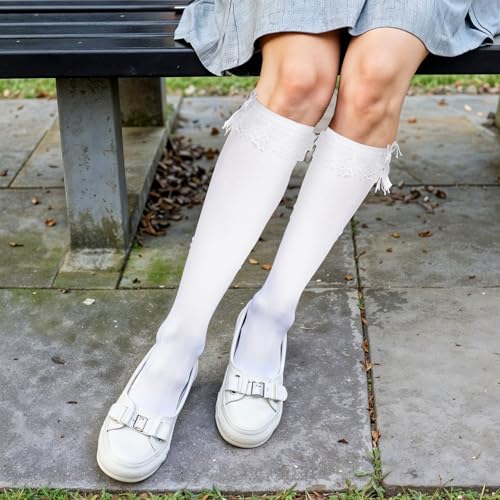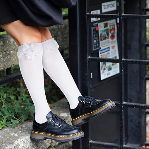 White Knee High Socks with Bow, Women's Soft Cotton Lace Ruffle Socks Over the Knee Tube High Stockings Cute Solid Color Lace Ruffle Bow Girls for Girls and Women 7