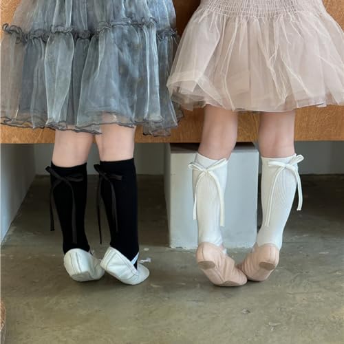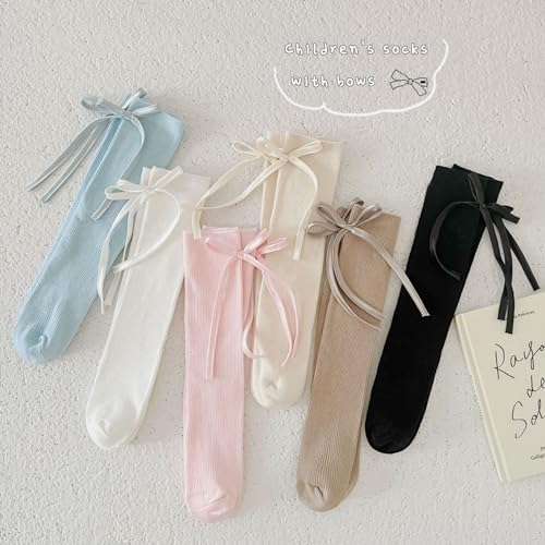 6 Pairs Girls Cotton Crew Socks with Ribbon Bow, 3/4/5/6/7/8 Years Spring Summer Thin Mid-Calf Knee Socks 6