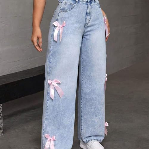 • Trendy Y2K Style – Fashionable wide-leg baggy jeans with bow detail, perfect for casual, streetwear, or daily outfits.