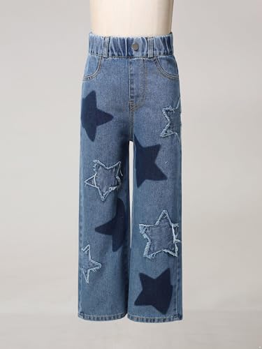 Aislor Kids Girls Frayed Star Straight Wide Leg Jeans Casual Washed Denim Pants Elastic Waist Denim Trousers with Pocket 6