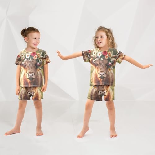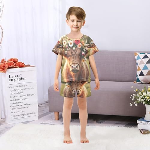 Spring Highland Cow Flower Pajama Set Short Sleeve PJ Set Cotton Summer Pajamas Sleepwear Soft 5Y 4