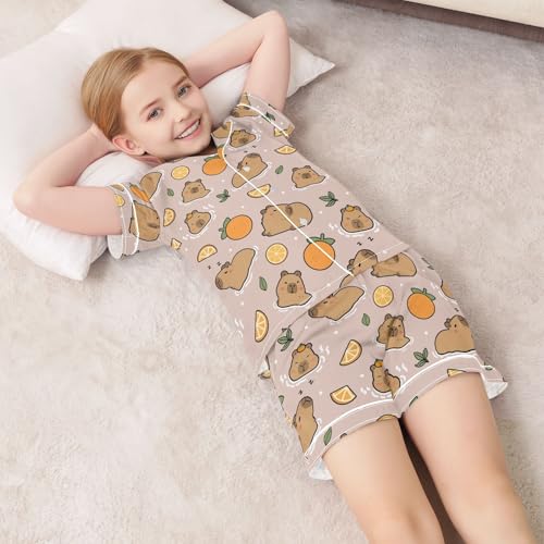 Cute Capybara with Oranges Pink Summer Satin Pajama Set, Cute Button-Down Sleepwear Pj Set for Sleep Wears 6