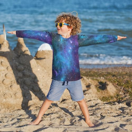 Kids Galaxy Stars Abstract Space Long Sleeve Rash Guard Shirt Blue Purple Swim Shirt for Boys Girls UPF 50+ 3-12T 3