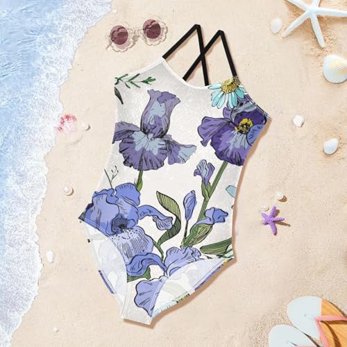 Girls One Piece Swimsuits Irises and Daisies Pattern Sport Halter Swimwear Beach Bathing Suit, 4T 6