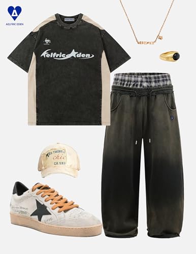 HOT ! Aelfric Eden Double Waist Washed Baggy Sweatpants Loose Wide Leg Plaid Patchwork Casual Pants with Pockets