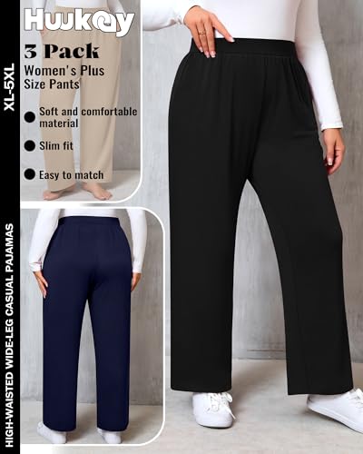 Huukeay 3 Pack Women's Plus Size Pants, High Waisted Wide Leg Pants Casual Pajamas Pants Loose Yoga Sweatpants with Pockets 3