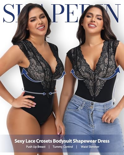 HOT ! SHAPERIN Sexy Lace Bodysuit for Women Tummy Control Thong Shapewear Deep V Neck Body Suits Corset Tops Going Out Tank Top