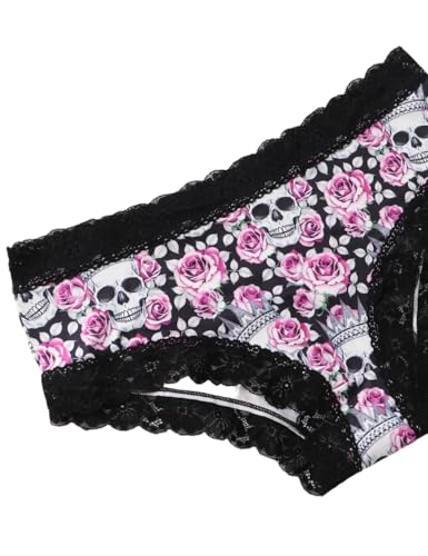 6pcs Gothic Chic Low Rise Bikinis Contrast Lace, Skull & Eyeballs & Stars Print, Women Comfortable Hipster Panties 6