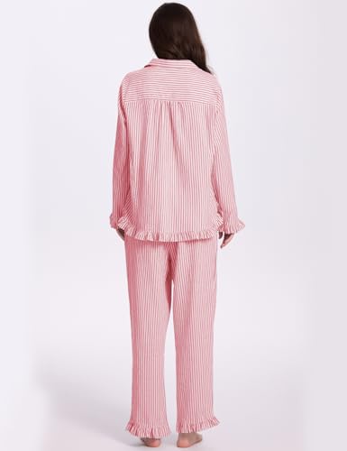 Flygo Womens Striped Pajama Sets 2 Piece Cotton Lounge Sets Button Down Top Straight Leg Pants with Pockets Y2K Pj Sleepwear 2