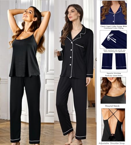 • THREE PIECE LONG PJ SETS: Three pieces cute sleepwear pajamas featuring long sleeve pjs top shirt and long lounge pants and camisole top for relaxing fit. This 3pcs cami pjs set with superior stitching and perfectly-lined hems, contrasted piping. Classical style of loungewear and sleepwear with an additional cami top. Breathable and comfy long pajama sets for women,