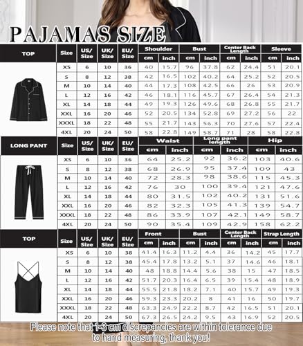 • PRODUCTS FEATURES: Button-down long sleeves pjs top shirt hits at hip,chest pocket,notch collar.It’s lightweight and soft pajamas for women. Long lounge pants with full elastic waistband and wider contrasted draw-string for adjustment is fits for any body size. Long pajama set is ideal for sleepwear,night wear or lounge set. Also with an extra sexy cami top designed with adjustable spaghetti straps .